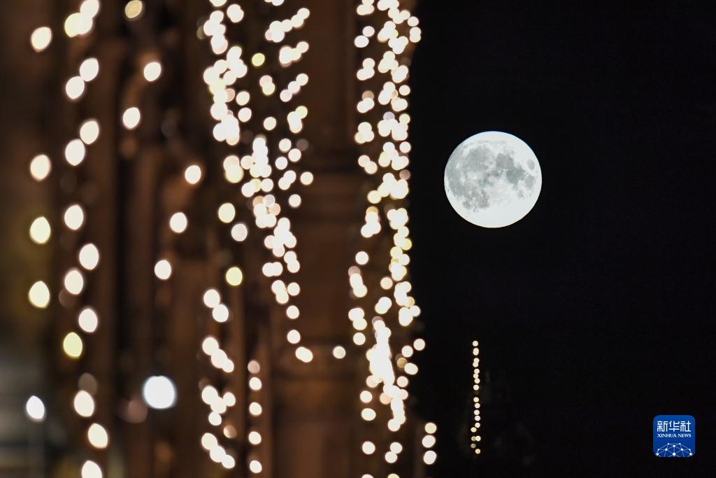 這是8月30日在俄羅斯首都莫斯科的古姆商場旁拍攝的“超級月亮”。