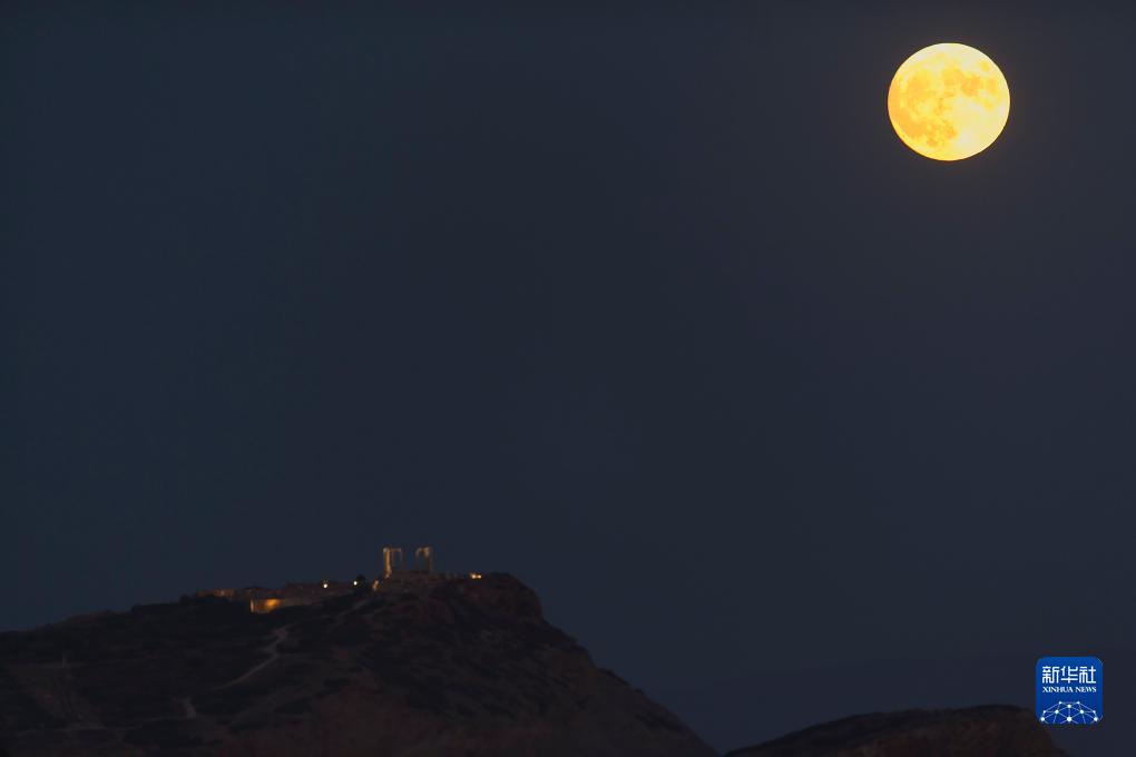 8月30日,“超級(jí)月亮”從希臘蘇尼翁角的波塞冬廟上空升起。