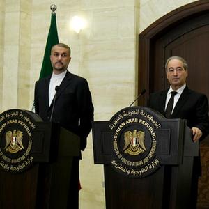 8月30日,在敘利亞大馬士革,敘利亞外長梅克達德(右)和伊朗外長阿卜杜拉希揚出席聯(lián)合記者會。