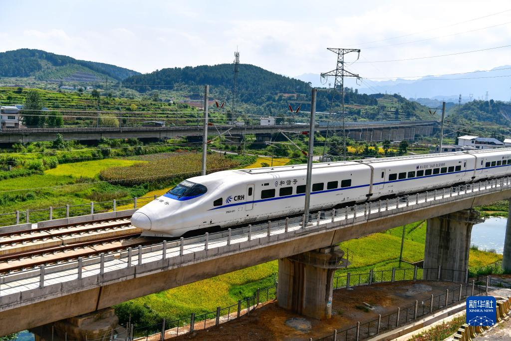 8月31日,一列動(dòng)車組列車經(jīng)過位于貴州省都勻市境內(nèi)的貴南高鐵營(yíng)盤清水河雙線特大橋。