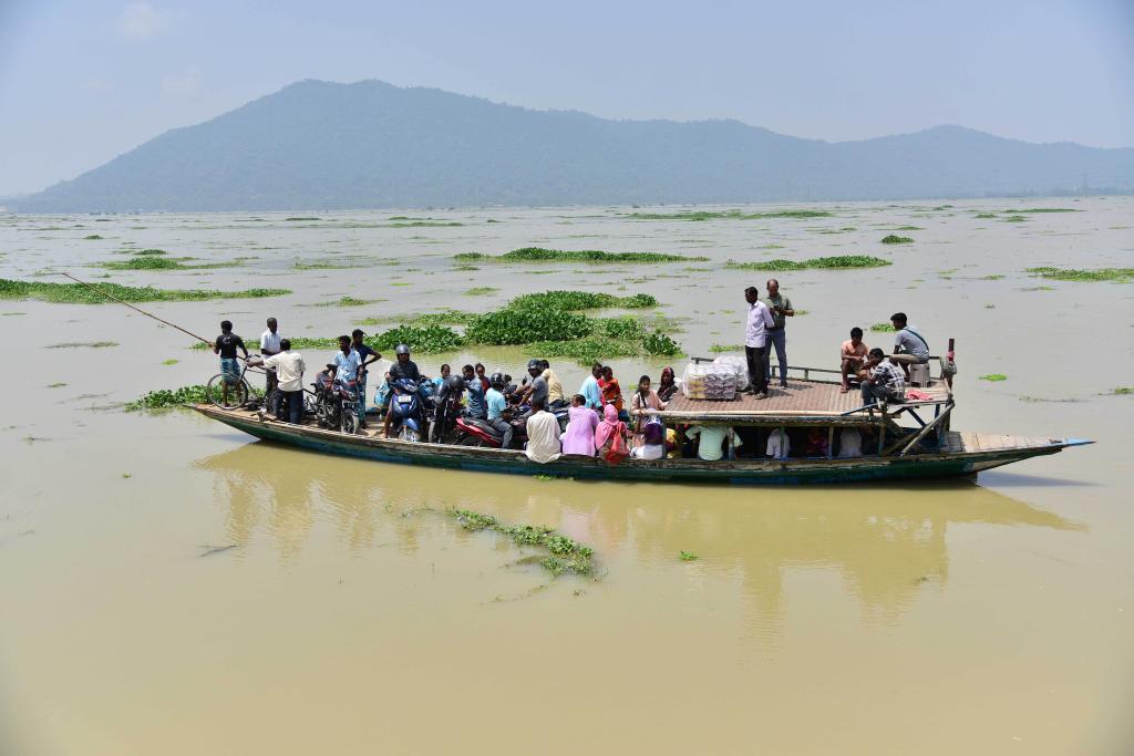 8月30日,人們在印度東北部阿薩姆邦一處洪災區域乘船出行。