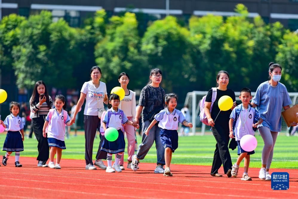 8月31日,在山東省青州市旗城小學,家長帶領一年級學生走進操場參加新學期開學典禮。