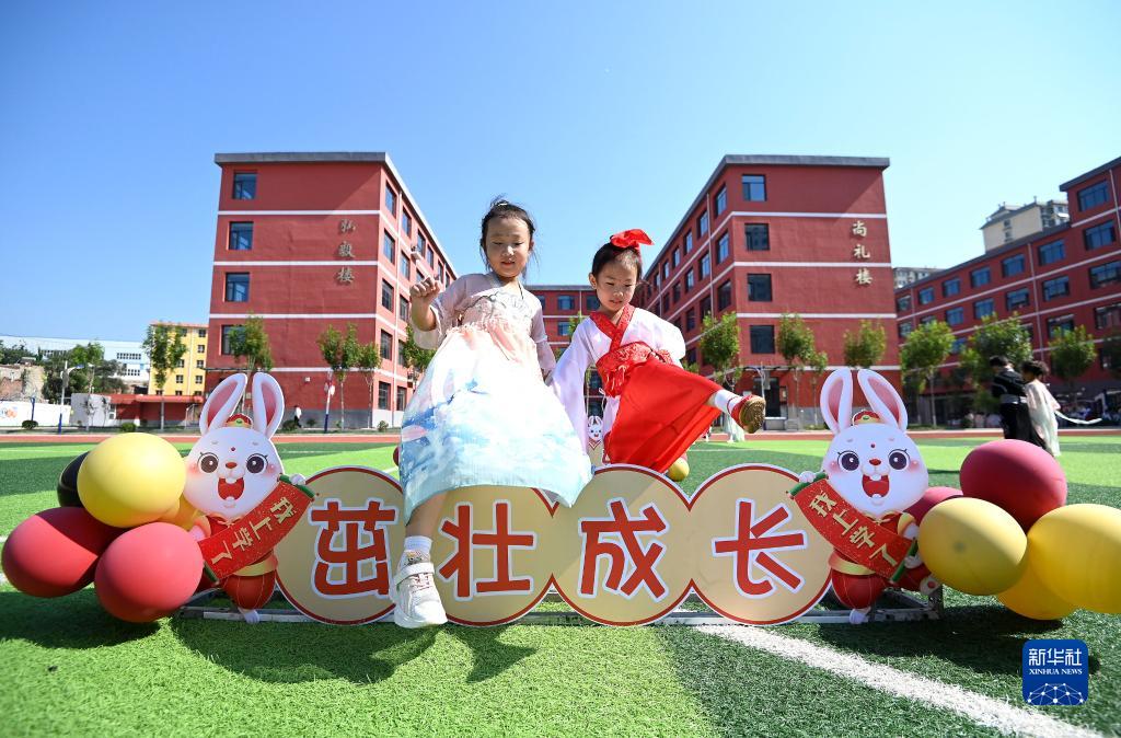 8月31日,河北省邯鄲市峰峰礦區(qū)滏北小學的一年級新生在進行“跨欄禮”。