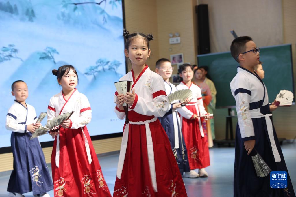 8月31日,福建省廈門(mén)市檳榔小學(xué)學(xué)生在新學(xué)期開(kāi)學(xué)式上誦讀古詩(shī)。