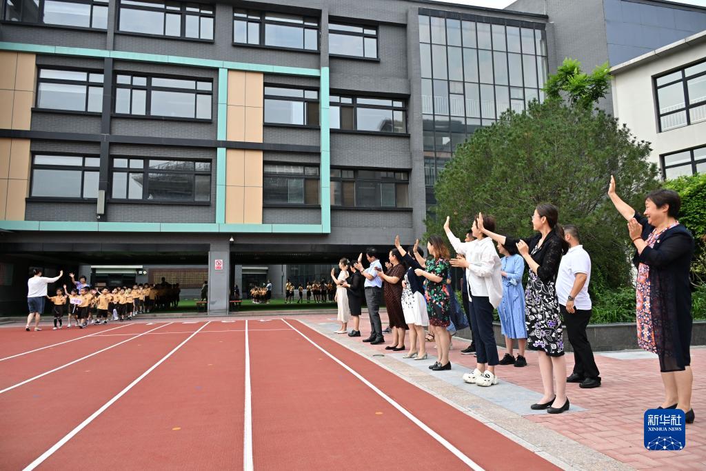 8月31日,北京第二實驗小學為一年級新生舉辦開筆禮。這是老師在開筆禮上迎接新生入場。