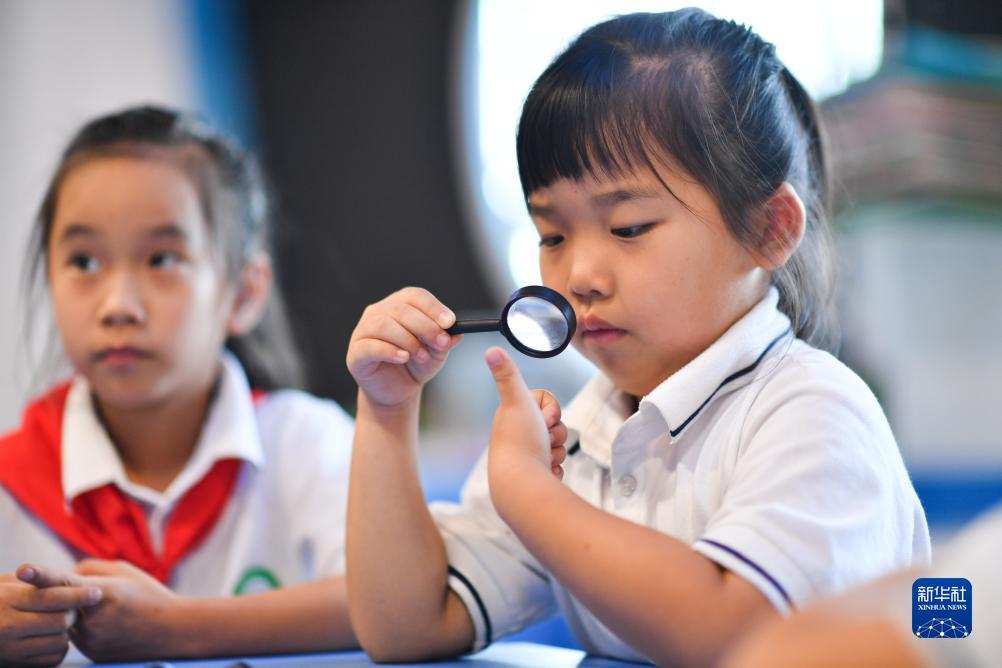 8月31日,在西安市鄠邑區新區小學,學生在科技主題開學第一課上學習使用放大鏡。