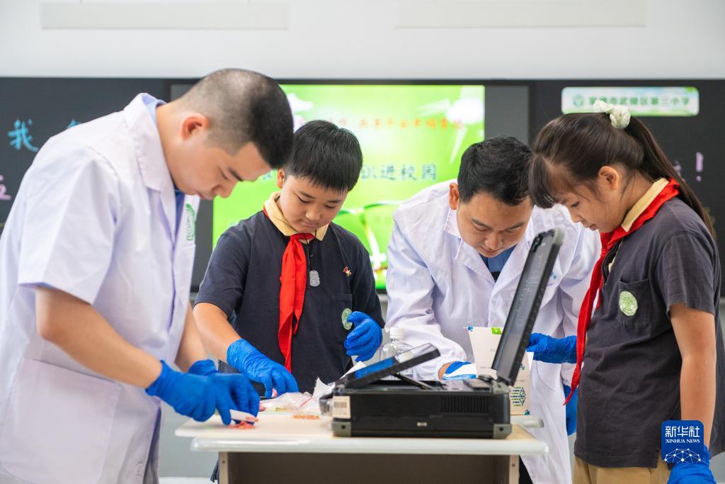 8月31日,湖南省常德市市場監督管理局在常德市武陵區第三小學開展關于食品安全的“開學第一課”。這是工作人員指導學生進行食品安全快速檢測實驗。