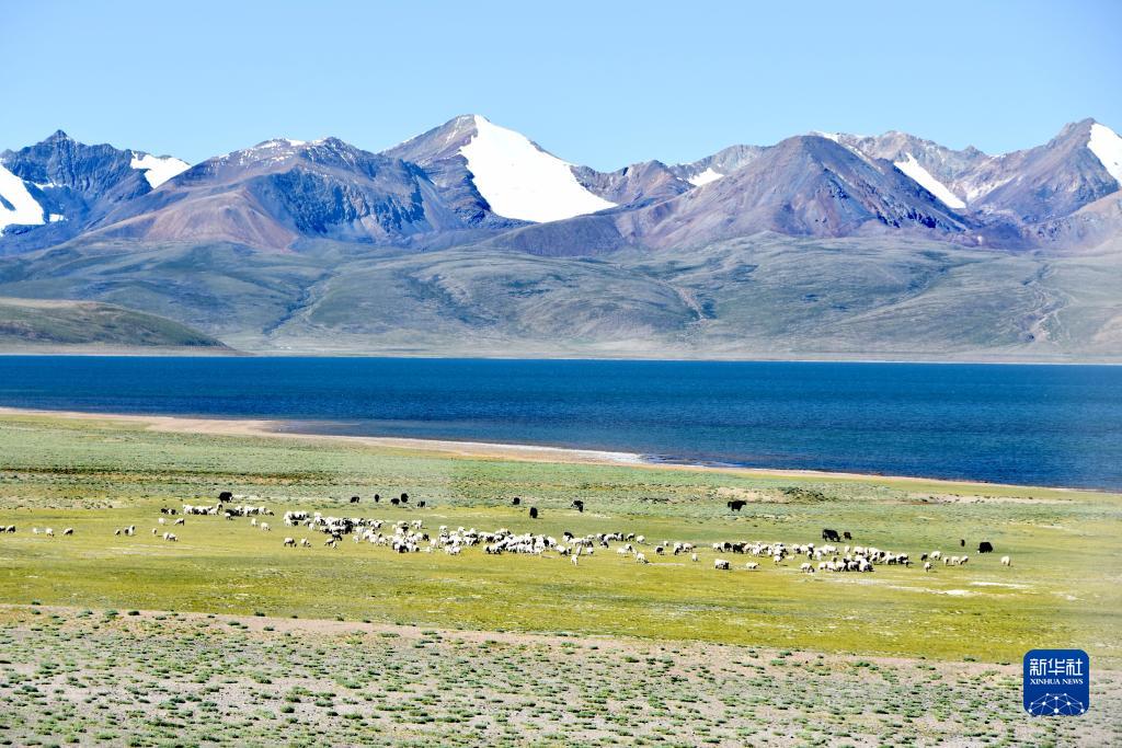打加錯湖畔的羊群、牛群(8月30日攝)。