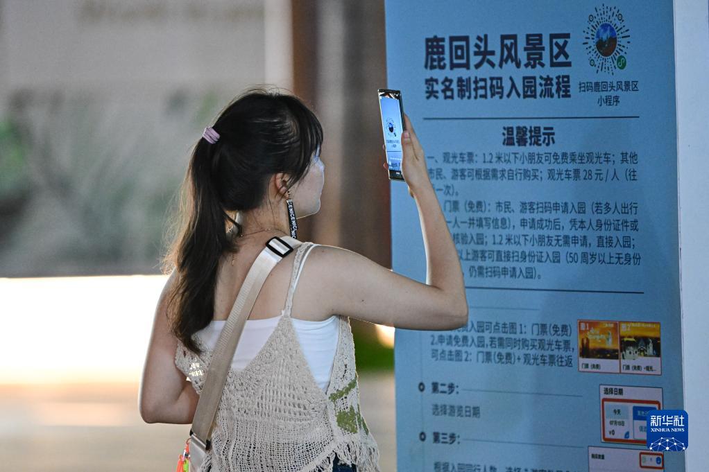 8月29日,游客在鹿回頭風景區外掃碼預約免費門票。