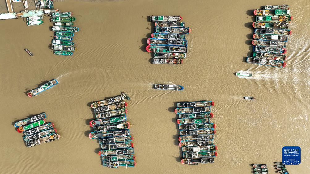 8月31日,漁船駛?cè)胝憬凵缴蚣议T漁港避風(fēng)(無人機照片)。