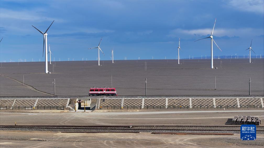 這是8月25日拍攝的將淖鐵路工程現(xiàn)場,軌道車在鐵路沿線進行測試(無人機照片)。
