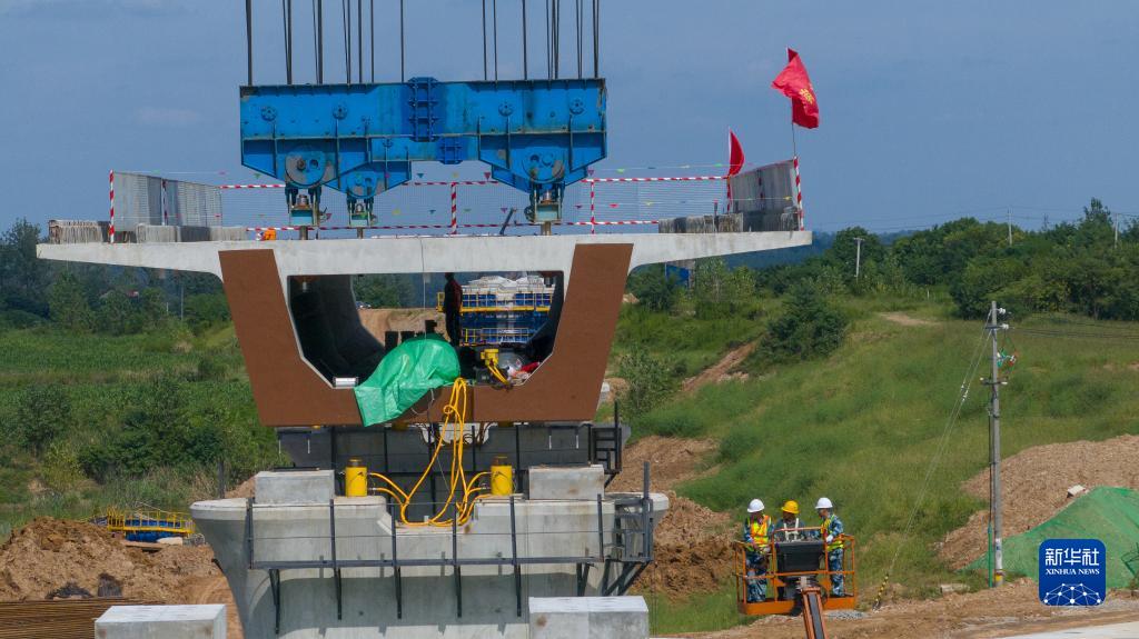 8月31日,工人在吊裝滬渝蓉高鐵滬寧段首榀箱梁(無(wú)人機(jī)照片)。