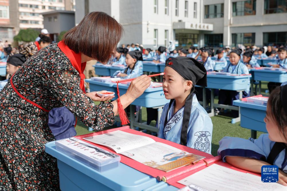 9月1日,在甘肅省蘭州市七里河區第二小學,老師在為一年級新生點朱砂啟智。