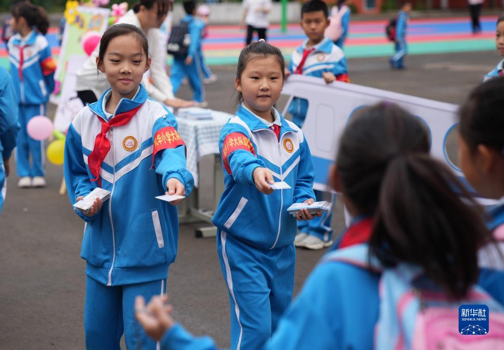 9月1日,哈爾濱市風華小學學生在為到校同學發放新學期“登機牌”。