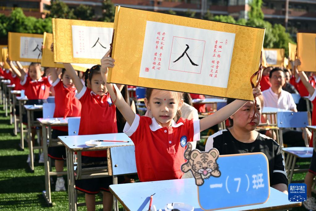 9月1日,在合肥市師范附屬第二小學,一年級新生展示自己在“開筆禮”儀式上用毛筆寫的“人”字。