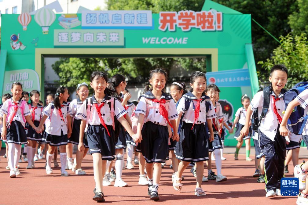 9月1日,在安徽省淮北市第三實驗小學,學生們背著書包陸續走進校園。
