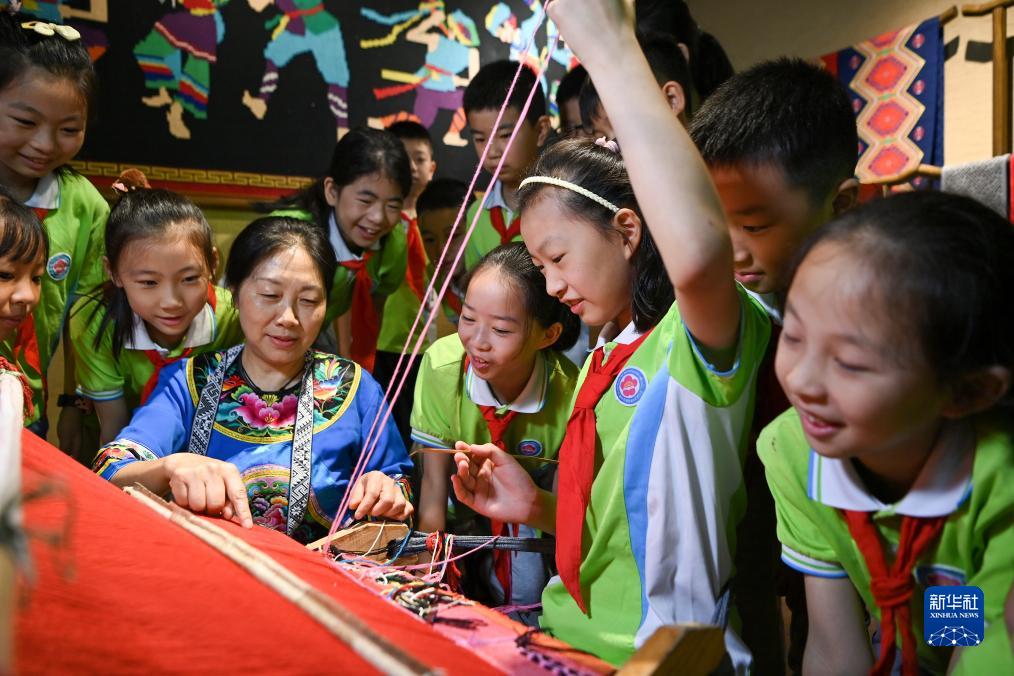 9月1日,重慶市酉陽土家族苗族自治縣桃花源景區,非遺技藝大師在給學生們上“開學第一課”——學習非遺“土家織錦”紡織技藝。