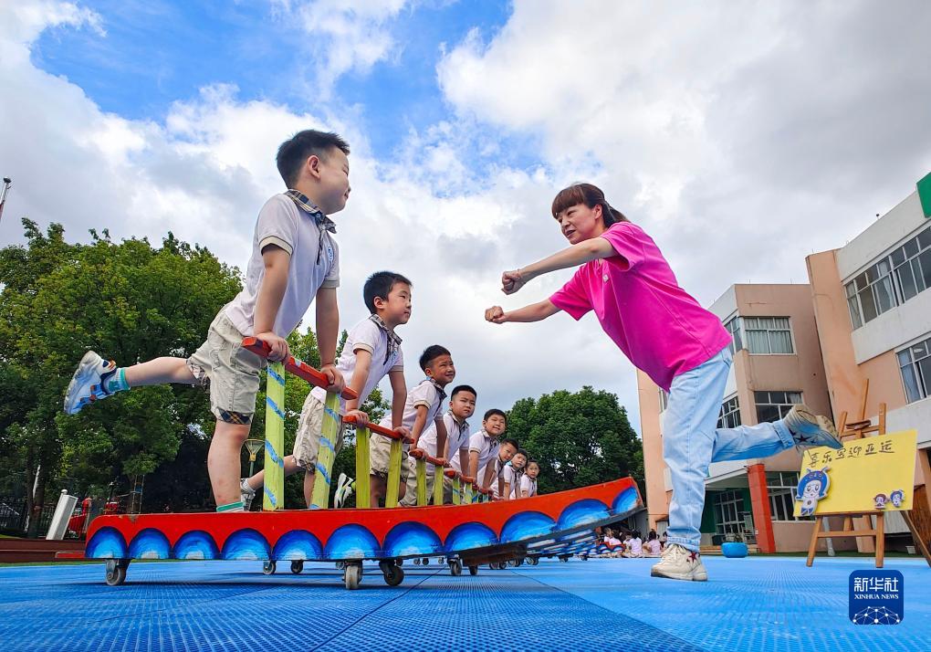 9月1日,浙江省寧波市鎮(zhèn)海區(qū)澥浦鎮(zhèn)中心幼兒園小朋友跟隨老師學(xué)習(xí)當(dāng)?shù)孛袼走\(yùn)動(dòng)“旱地泥艋”。