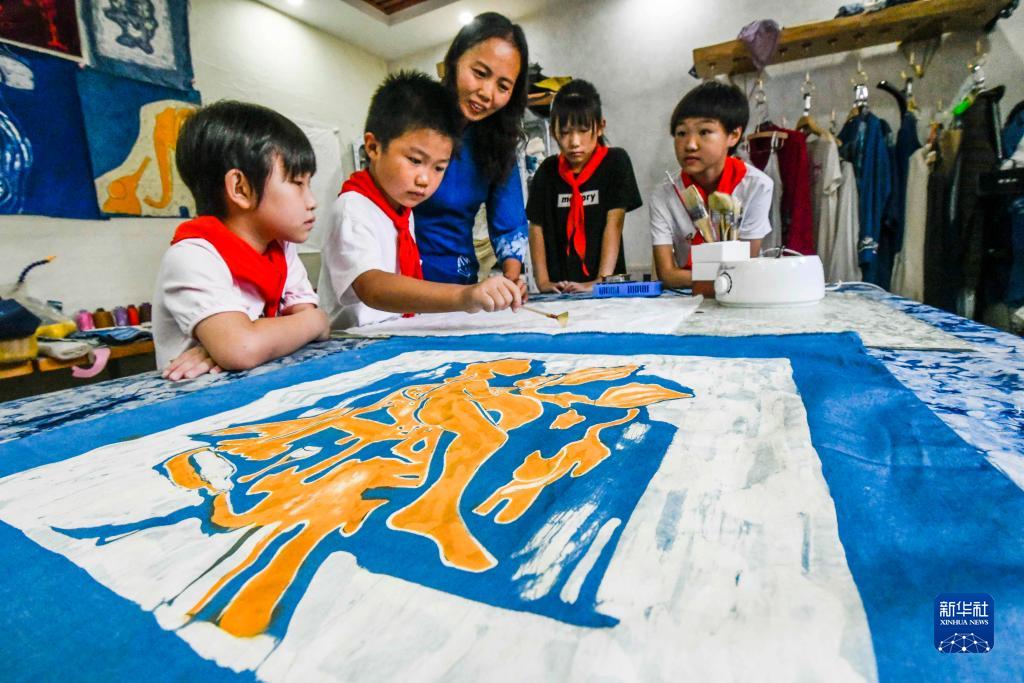 9月1日,河北省唐山市路北區(qū)興盛麗景小學(xué)的學(xué)生在蠟染作坊練習(xí)蠟染技藝。