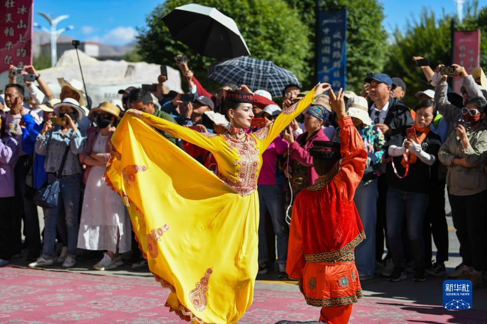 在新疆塔什庫爾干塔吉克自治縣帕米爾旅游區游客服務中心,文工團演員跳舞歡迎游客(8月29日攝)。