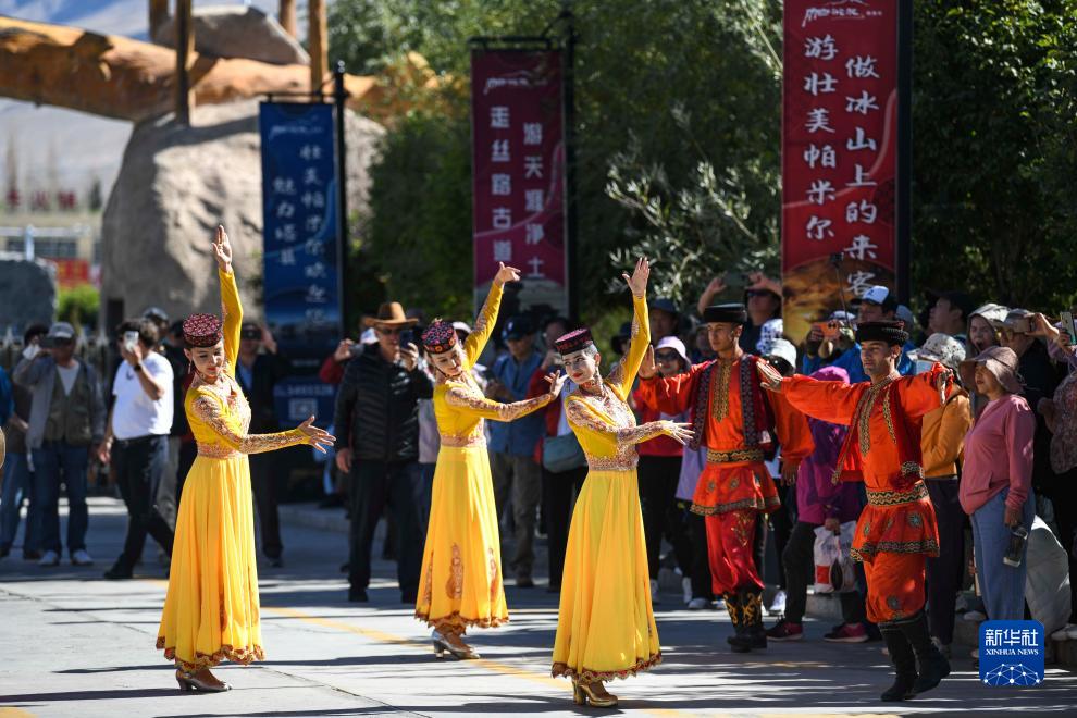 在新疆塔什庫爾干塔吉克自治縣帕米爾旅游區游客服務中心,文工團演員跳舞歡迎游客(8月29日攝)。