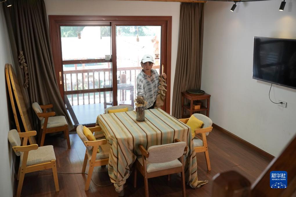 8月31日,旬陽市構(gòu)元鎮(zhèn)羊山民俗村的工作人員在收拾整理客房。