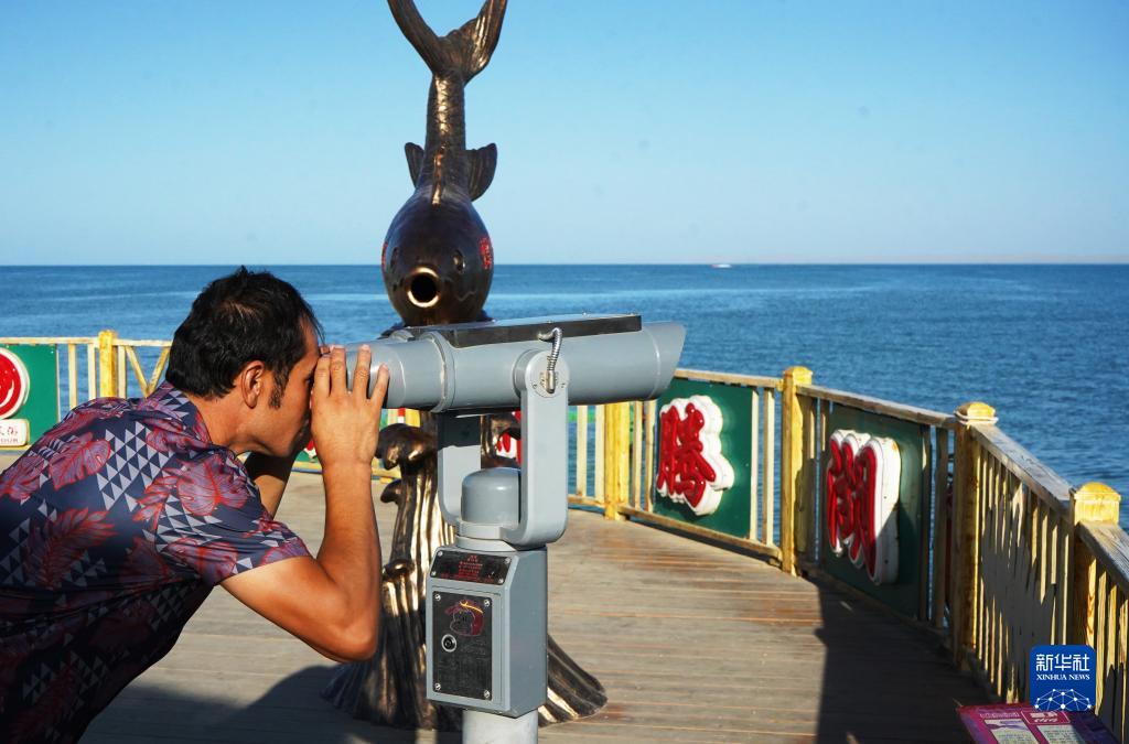 8月31日,在新疆博斯騰湖大河口景區,游客使用望遠鏡觀察遠方。