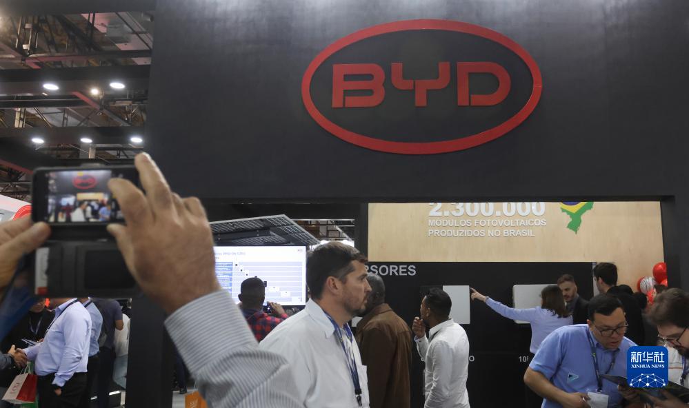 8月30日,在巴西圣保羅舉行的第十屆南美國際太陽能展上,一名參觀者拍攝比亞迪展臺。