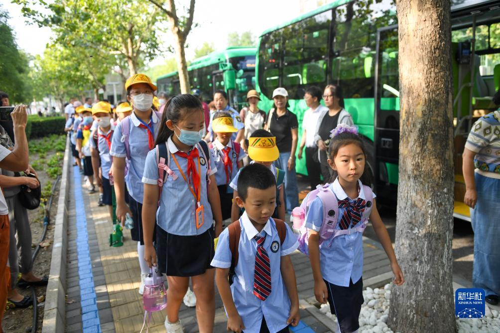 9月1日,在北京市豐臺區(qū)第一小學外,乘坐通學公交車到達的學生在老師的指引下排隊入校。