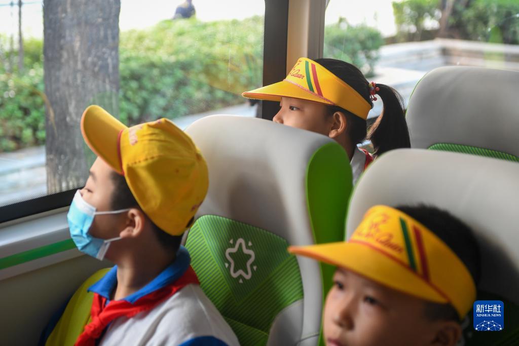 9月1日,幾位北京市豐臺區第一小學的學生在通學公交車上向外張望。