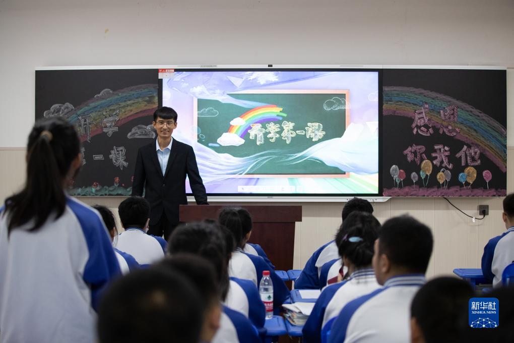 9月1日,在哈爾濱市延壽縣第四中學,一名教師在開學第一課上講述校園重建的經過。