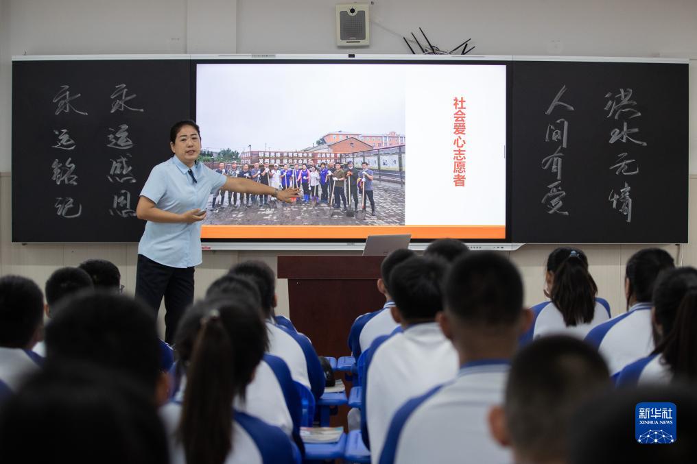 9月1日,在哈爾濱市延壽縣第四中學,一名教師在開學第一課上講述校園重建的故事。