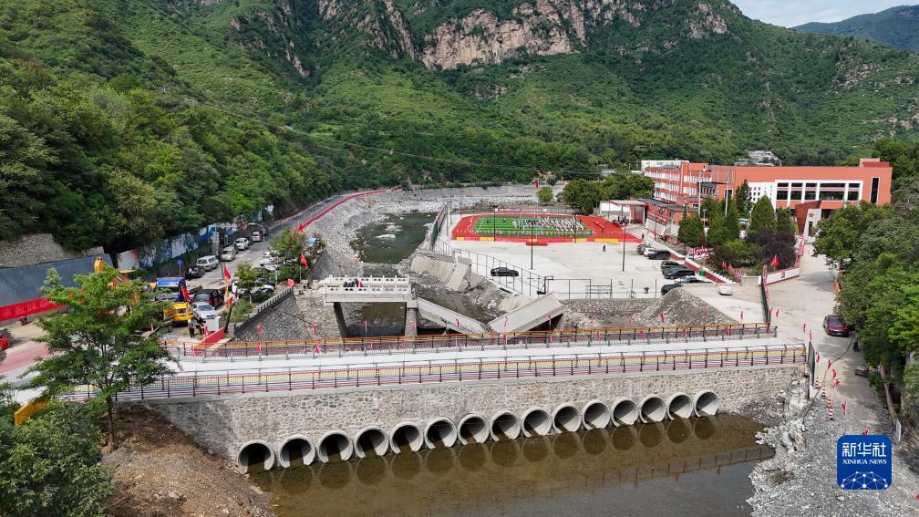 9月1日,在北京市房山區霞云嶺鄉霞云嶺中心小學,因強降雨受損的學校操場和橋梁修繕一新(無人機照片)。