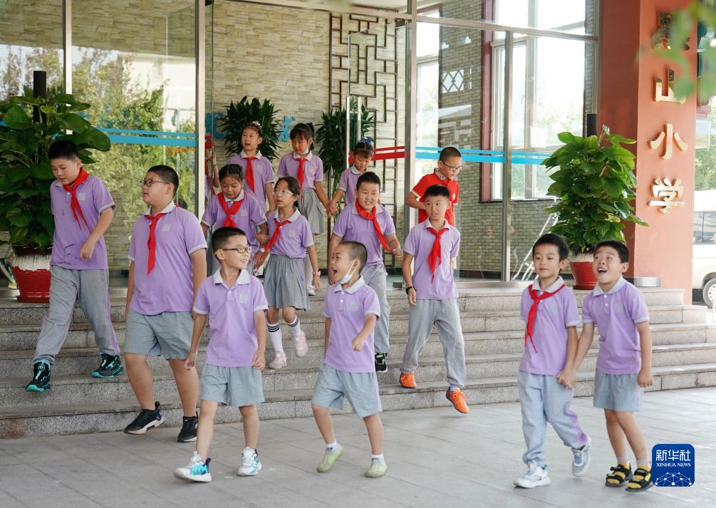 9月1日,在京師實驗中學借址開學的門頭溝區黑山小學的學生在校園中行走。