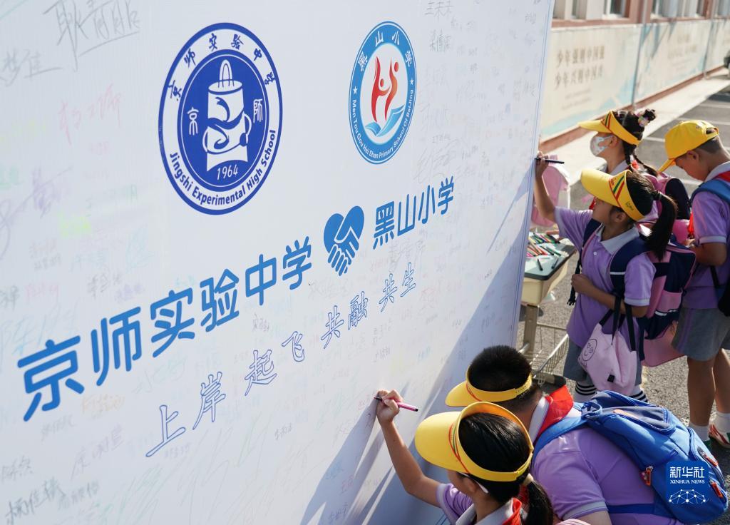 9月1日,在京師實驗中學借址開學的門頭溝區黑山小學的學生來到校園。