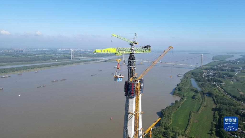 這是9月1日拍攝的中交二航局巢馬城際鐵路馬鞍山公鐵兩用長江大橋南主塔首節段鋼塔吊裝現場(無人機照片)。