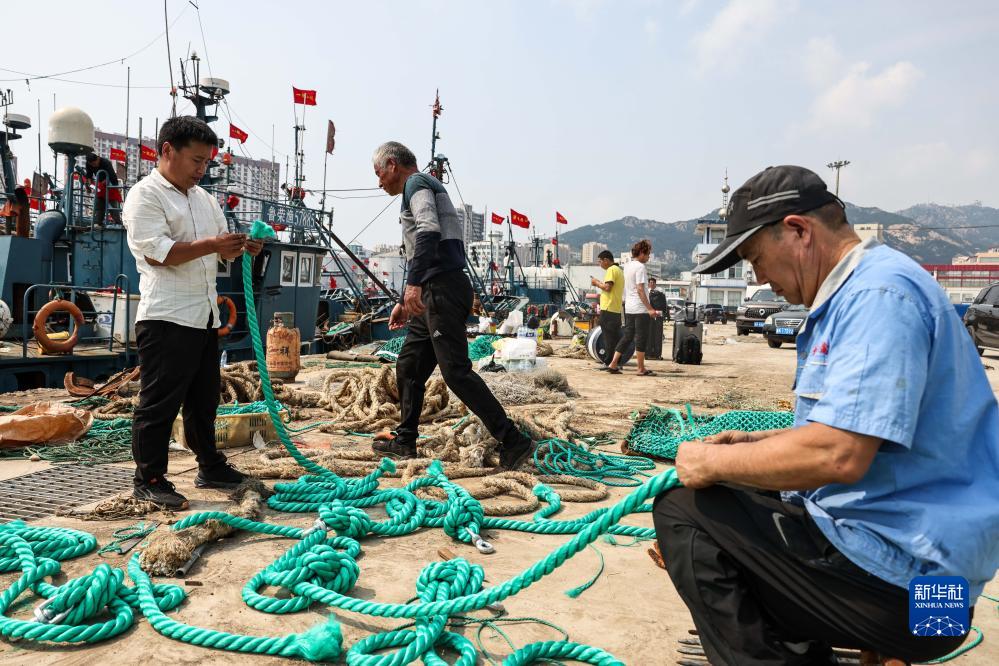 9月1日,在山東省榮成市石島漁港,漁民在整理纜繩。