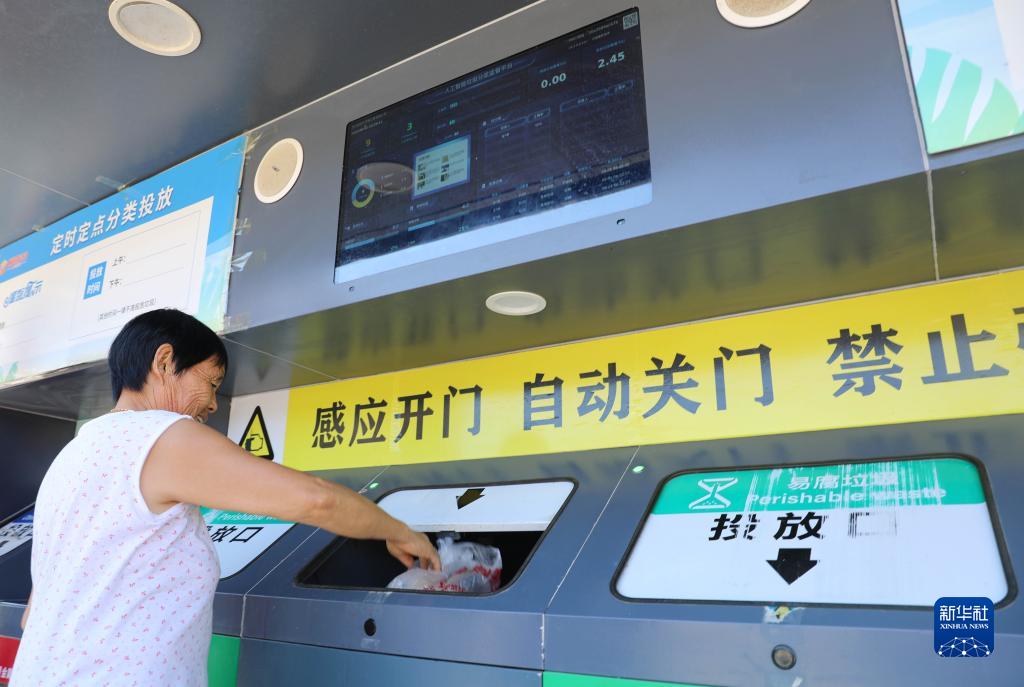 9月1日,莊墓鎮棗林社區居民在使用智能垃圾分類回收設備。