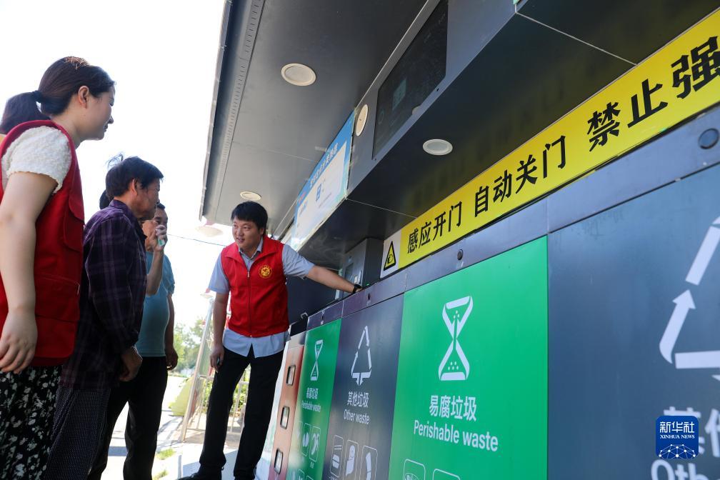 9月1日,在莊墓鎮(zhèn)棗林社區(qū),志愿者指導(dǎo)居民使用智能垃圾分類回收設(shè)備。