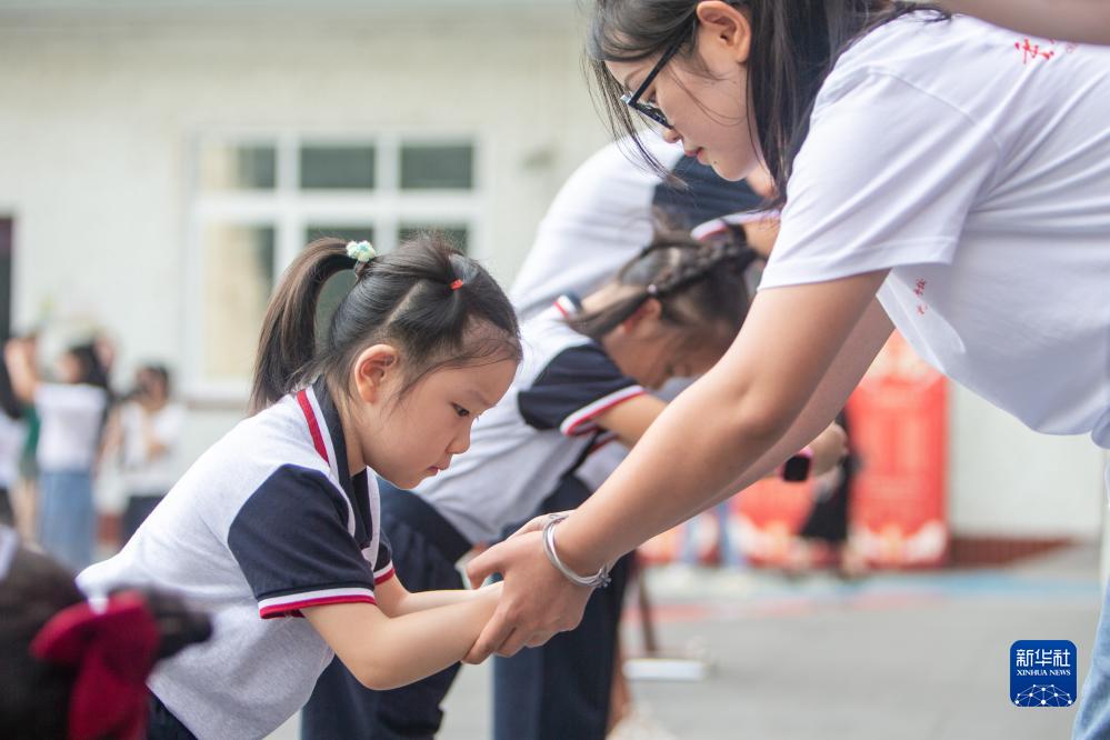 9月1日,在重慶育才實(shí)驗(yàn)學(xué)校華巖校區(qū),豆豆在開學(xué)典禮上向老師行拜師禮。