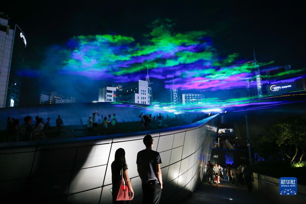 當日,大型新媒體藝術燈光秀“首爾之光·2023秋季”在韓國首爾東大門設計廣場亮相。燈光秀充分利用建筑的曲面外墻,融合煙霧、燈光、影像和音樂,吸引人們到現場參觀。該燈光秀將持續到9月10日。