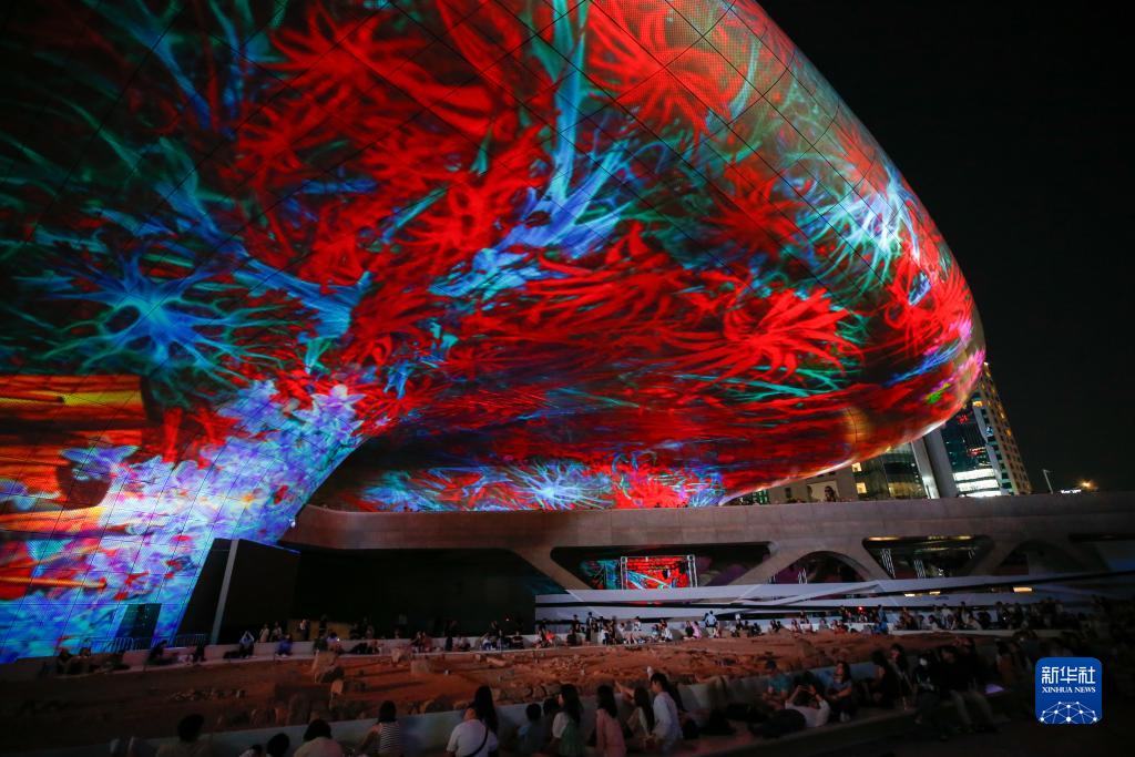 當日,大型新媒體藝術燈光秀“首爾之光·2023秋季”在韓國首爾東大門設計廣場亮相。燈光秀充分利用建筑的曲面外墻,融合煙霧、燈光、影像和音樂,吸引人們到現場參觀。該燈光秀將持續到9月10日。