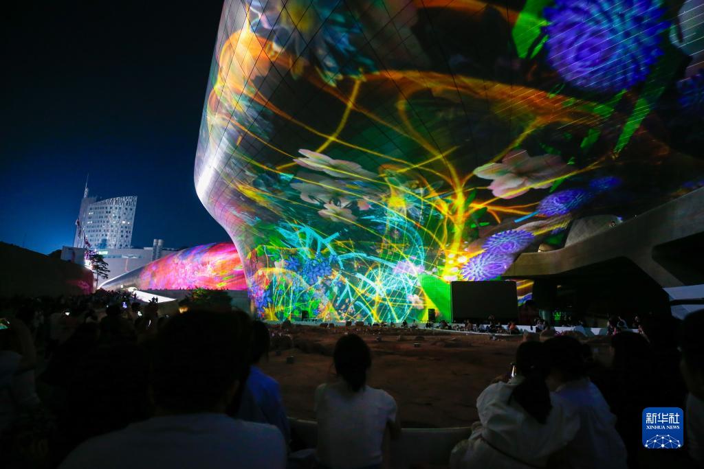 9月1日,人們在韓國首爾東大門設計廣場觀看燈光秀。