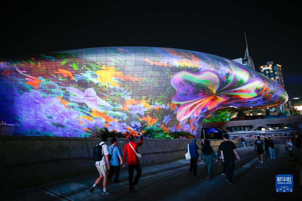 當日,大型新媒體藝術燈光秀“首爾之光·2023秋季”在韓國首爾東大門設計廣場亮相。燈光秀充分利用建筑的曲面外墻,融合煙霧、燈光、影像和音樂,吸引人們到現場參觀。該燈光秀將持續到9月10日。