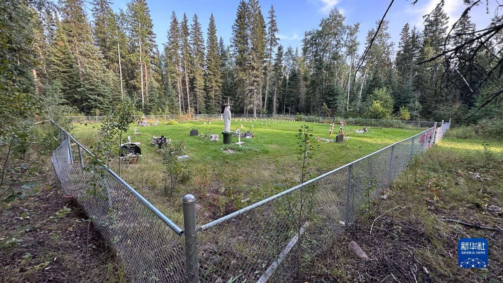 這是8月31日在加拿大薩斯喀徹溫省博瓦爾印第安人寄宿學(xué)校舊址拍攝的用粉色旗子標(biāo)出的疑似兒童和嬰兒墓地。