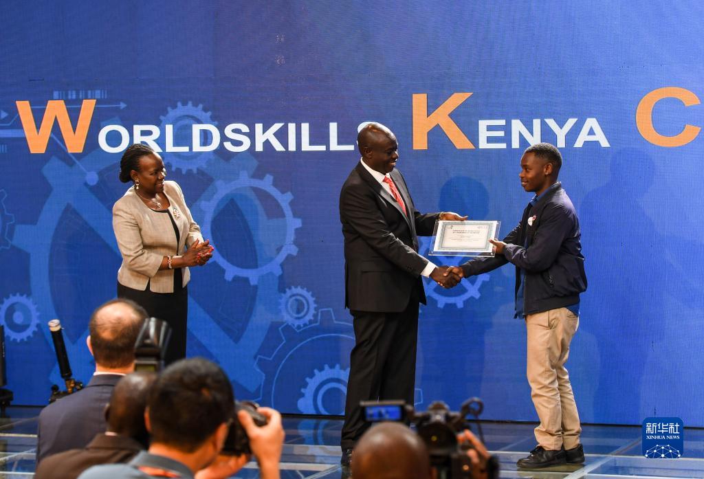8月31日,在肯尼亞首都內(nèi)羅畢,肯尼亞副總統(tǒng)里加西·加查瓜(中)為第八屆非洲職業(yè)技能挑戰(zhàn)賽閉幕式的獲獎(jiǎng)選手頒發(fā)證書。