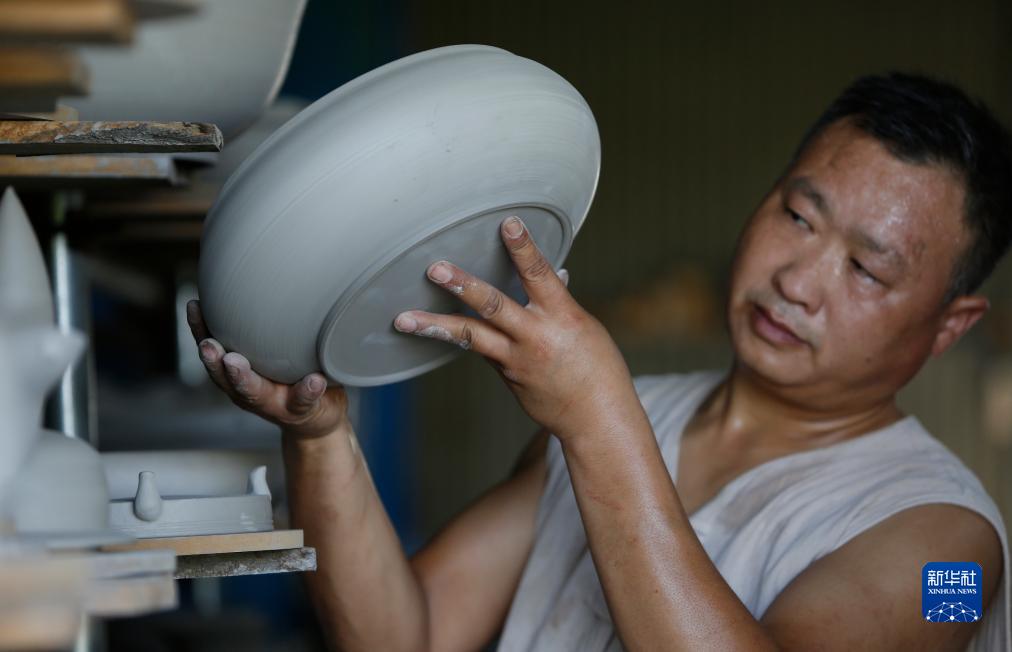 8月31日,在清涼寺村的一家汝瓷生產企業,汝瓷藝人劉國和在車間里查看素坯。