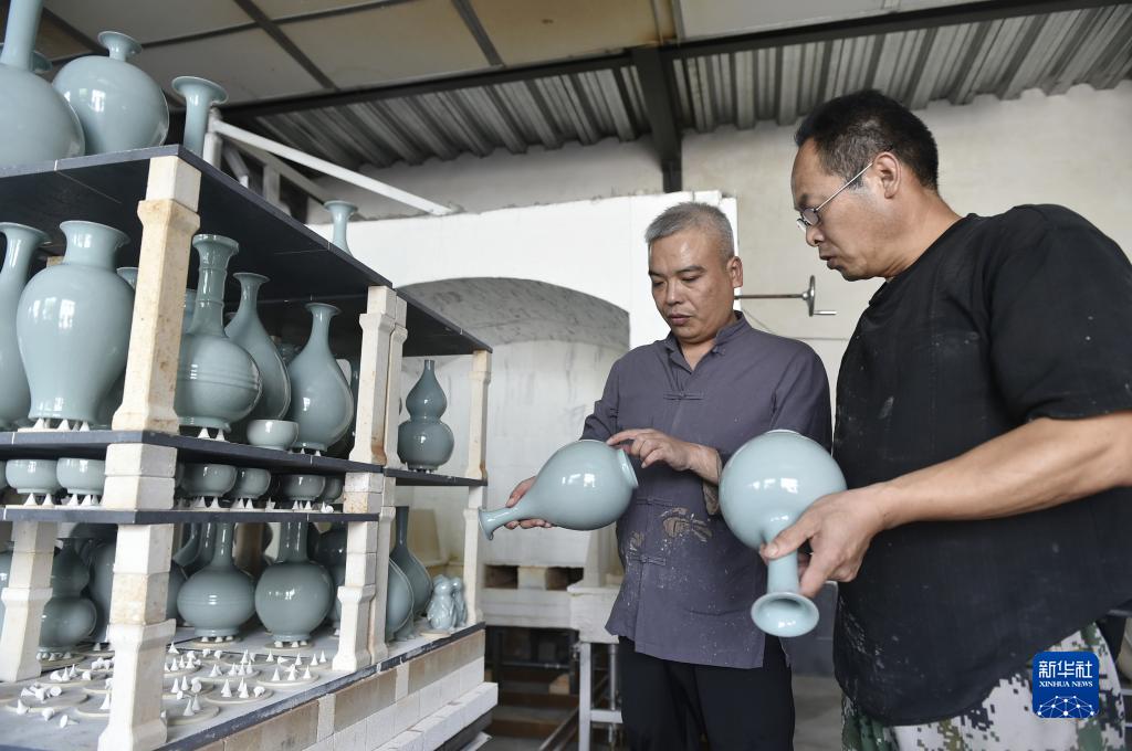 8月31日,在清涼寺村的一家汝瓷生產(chǎn)企業(yè),汝瓷藝人王占穩(wěn)(左)和工人在車間里檢查燒制完成的汝瓷產(chǎn)品。