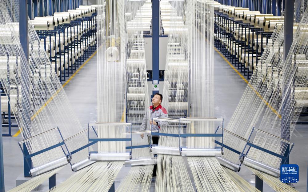 在中國建材集團西寧萬噸碳纖維生產基地,工作人員整理碳纖維原絲(8月27日攝)。