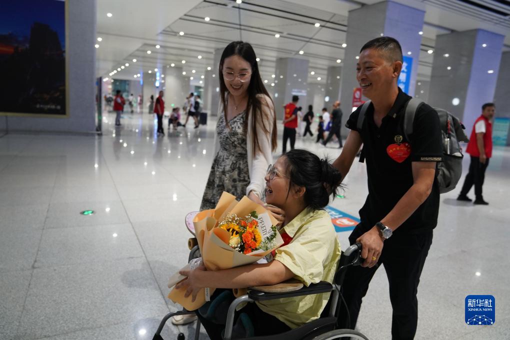抵達山東臨沂后,學(xué)校老師向蔣張子怡送上了花束(8月31日攝)。